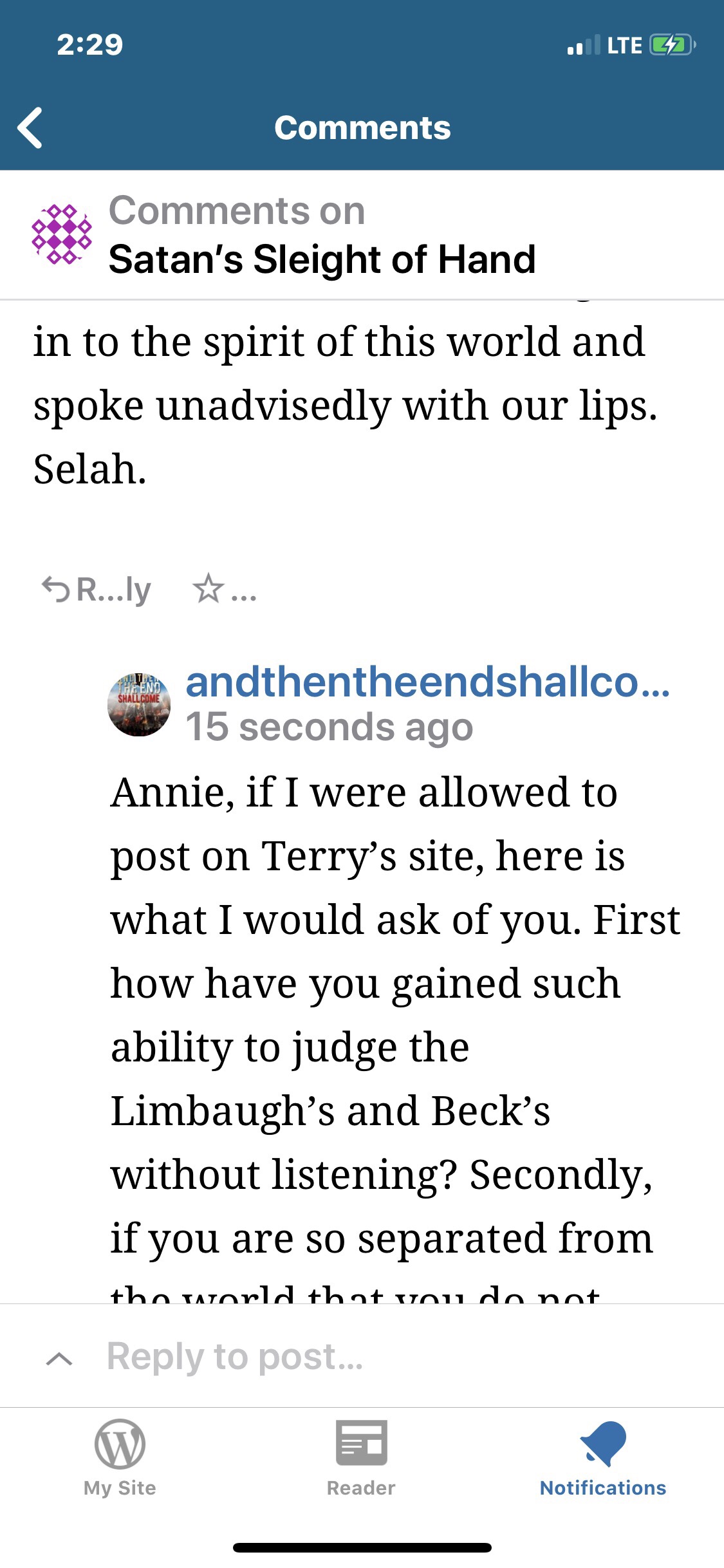 Annie, if I were allowed to post on Terry’s site, here is what I would ask of you. First how have you gained such ability to judge the Limbaugh’s and Beck’s without listening to them? Secondly, if you are so separated from the world that you do not become informed by those who can see what is happening, those who stand against abortion, and rioting, and the taking of our freedom of speech, which grants to us the only reason that has allowed the spreading of this gospel of our Lord and savior; then how do you determine where to place your vote? Unfortunately for those like yourself, few pulpits broadcast this information today.
