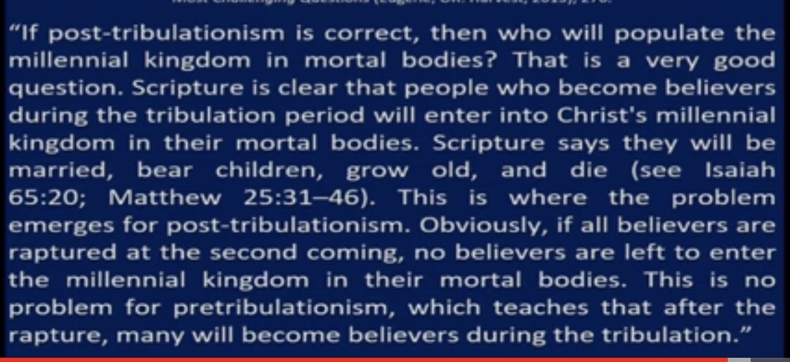 Andy Woods says that pre-Trib teaching has the best answers to all of these questions, but do they? He says that Post-Trib has no answer, but is he right? Andy quotes Ron Rhodes: (and I will paraphrase his points) those, who are not the bride, but who enter the millennium will have mortal bodies, they will marry, they will bear children; grow old; and die. Non mortals will not do any of this. Here is his quote: to read it you must click on it and enlarge it.