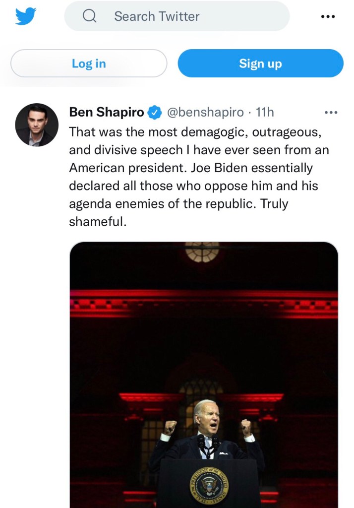 “ Much of what Biden said about DJT and the radical MAGA crazies is true. To me, the biggest threat they pose results from the big lie and the resulting loss of faith in our elections and institutions, making violence/revolution acceptable in their minds.”
