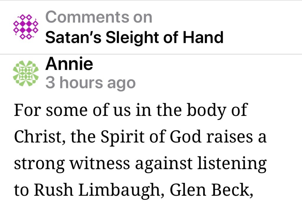 ANNIE commented: “For some of us in the body of Christ, the Spirit of God raises a strong witness against listening to Rush Limbaugh (now deceased), Glen Beck, and the conservative Fox News talking heads. For what we have experienced first-hand has been what God wrote to us as wisdom …. walk with the wise …. make no friendship with an angry man, lest you learn his ways …. if you perceive foolishness in the mouth of a man, then go from his presence. What we have experienced in our friendships, in our local assemblies ….????? The reactions of Christians are without restraint, without the spirit of God’s gentleness, meekness or wisdom …. and out of the mouths words are spouted in a common tone …. just like the talking head that these brethren spend three-plus hours a day taking in, drinking of the spirit that is talking through these ungodly, or should I say unChristlike, communicators.