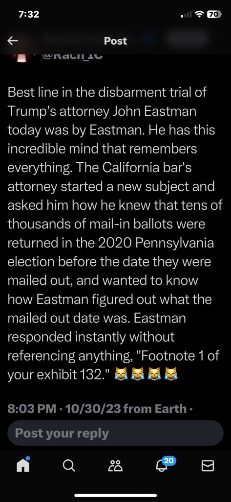 By the way the trial in which I testified on behalf of Nationwide back in the 80’s was later dismissed by the plaintiffs. Hopefully John Eastman will have as Just an outcome, but then we know how these trials are being rigged by likely the same people who rigged the elections.