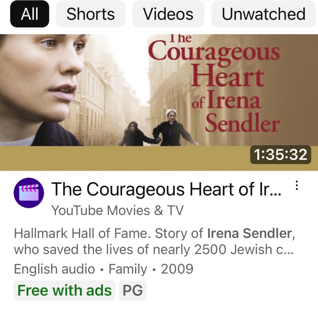 This is history that is missing among the young people of our nation. This is why we are seeing what we are in the streets in America. Our failure as Christians here in America is largely responsible for this deception within our education system. Don’t get involved in the politics of your day to assure that truth is told concerning this worlds history, and your own children may one day be torn from their homes as these children were. This movie is free on U-TUBE. It may already be too late to effect needed change, but we can at least display the courage of Miss Sendler.