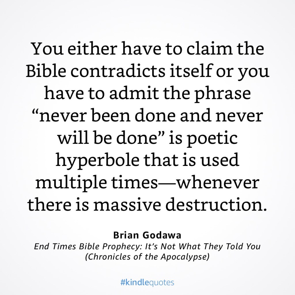 Godawa’s argument would be destroyed if what Jesus stated was literal for the world. He asks what could be worse than the destruction from Noah’s flood. So let’s consider: