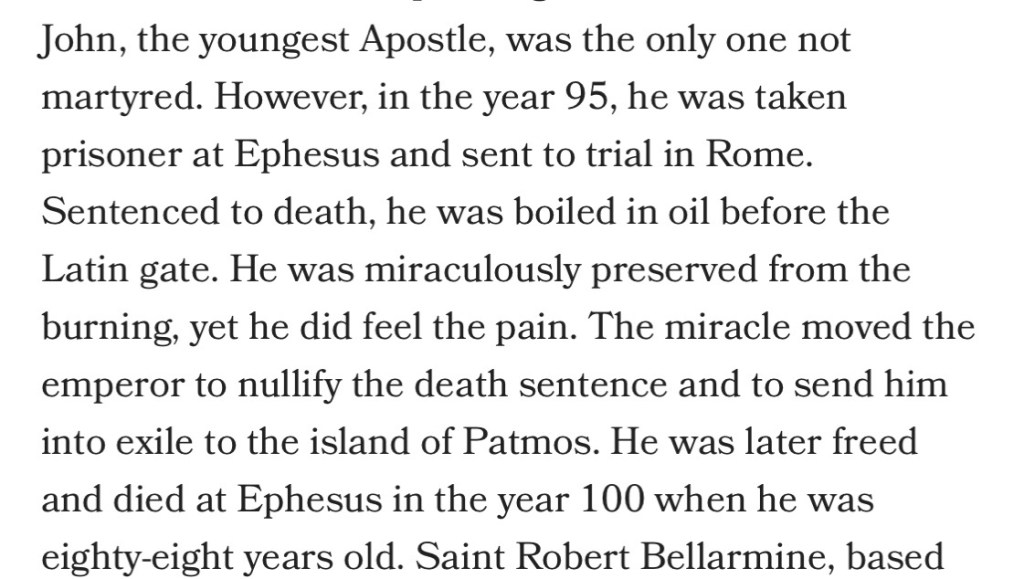 Thomas was stabbed to death at Mylapore, India, in the year 74. He was the same age as Our Lord. John lived to much later 100-105 AD, and John wrote the Revelation while in Exile on Patmos. *All of this according to Catholicism.org