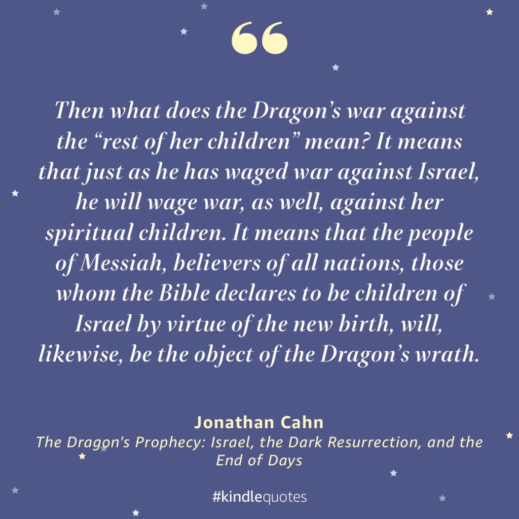 I’ve been reading one of Jonathan Cahn’s latest books “The Dragon’s Prophecy”. Here he is speaking on Revelation 12, concerning Satan as this dragon, who first goes after Israel, and when he is unable to do to her what he wants, he turns to her offspring. Jonathan calls these offspring “The Others”. Here is what he says: