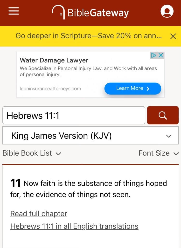 Note that the Bible references “evidence” in its definition. Your issue is: “where is the evidence”. You, I think would agree with me that faith is a personal matter. One of the definitions above is the reliance or belief in and therefore upon the testimony of another. You have not yet experienced God. That is your testimony. Your evidence therefore is in your own testimony and the testimony of others whose are like minded to you own. You have determined that the evidence of believers is non evidence, yet individuals can through testimony give you their evidence. But you must decide if their witness is credible. I’ve offered to share my testimony with you in a past letter that I had written to you.