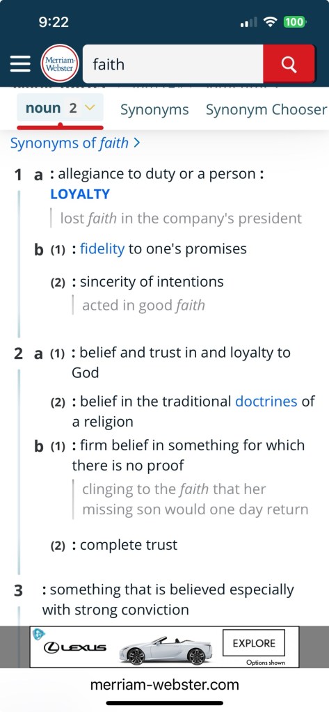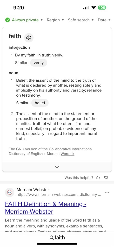 Bob, Ellen told me about your conversation with her and with Julie yesterday. I want you to know that I appreciate your attempt at honesty within your own thinking. As I understand it the three of you were discussing faith. You and I have had similar discussions in the past. Here are some of the definitions. Your’s is one listed. There is also a Bible definition, that I also show below:
