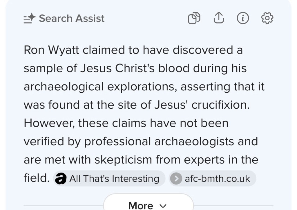 I recently shared the claimed discovery of Ron Wyatt’s of Jesus Blood which he says that he found and had had tested. The blood was to be from a crevasse within the caverns beneath Golgotha. He states the Arc of the Covenant to have been found there, and then the blood’s discovery came after. I shared this with my pastor friend. I’ll link for you here the testimony of one of the lab workers who supposedly performed the bloods testing.