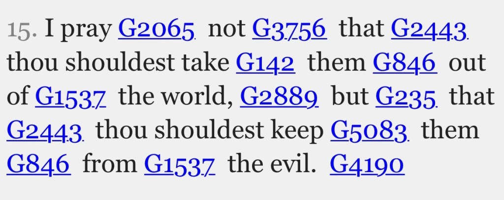 It is obvious when reading Jesus prayer for us (His Elect), that His intention is not to have us removed from Satan’s wiles and from his testing, but instead to keep us from its evil. He says here in these two verses: don’t take them out of the world, but keep them from both the evil and iI believe the same to be true for the hour of testing. God does not have to remove us from the world in order to keep us from either the evil of the world, or from the hour of the test for the world. Satan and his demons are always present until he is destroyed. Same for time it is present until it is no more. But just as Satan need have no effect on God’s elect even when here, so to a given hour or test for the whole world need not affect we, who are no longer of this world, but still present in it.